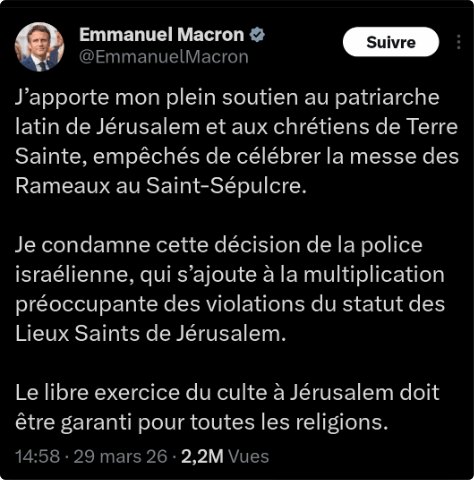 Le « statut [violé] des lieux Saints de Jérusalem » sous entend à mon avis la fréquente intox islamiste6 sur les mosquées de la place du temple. On se pose la question de savoir par qui notre président a été influencé pour ce Tweet?