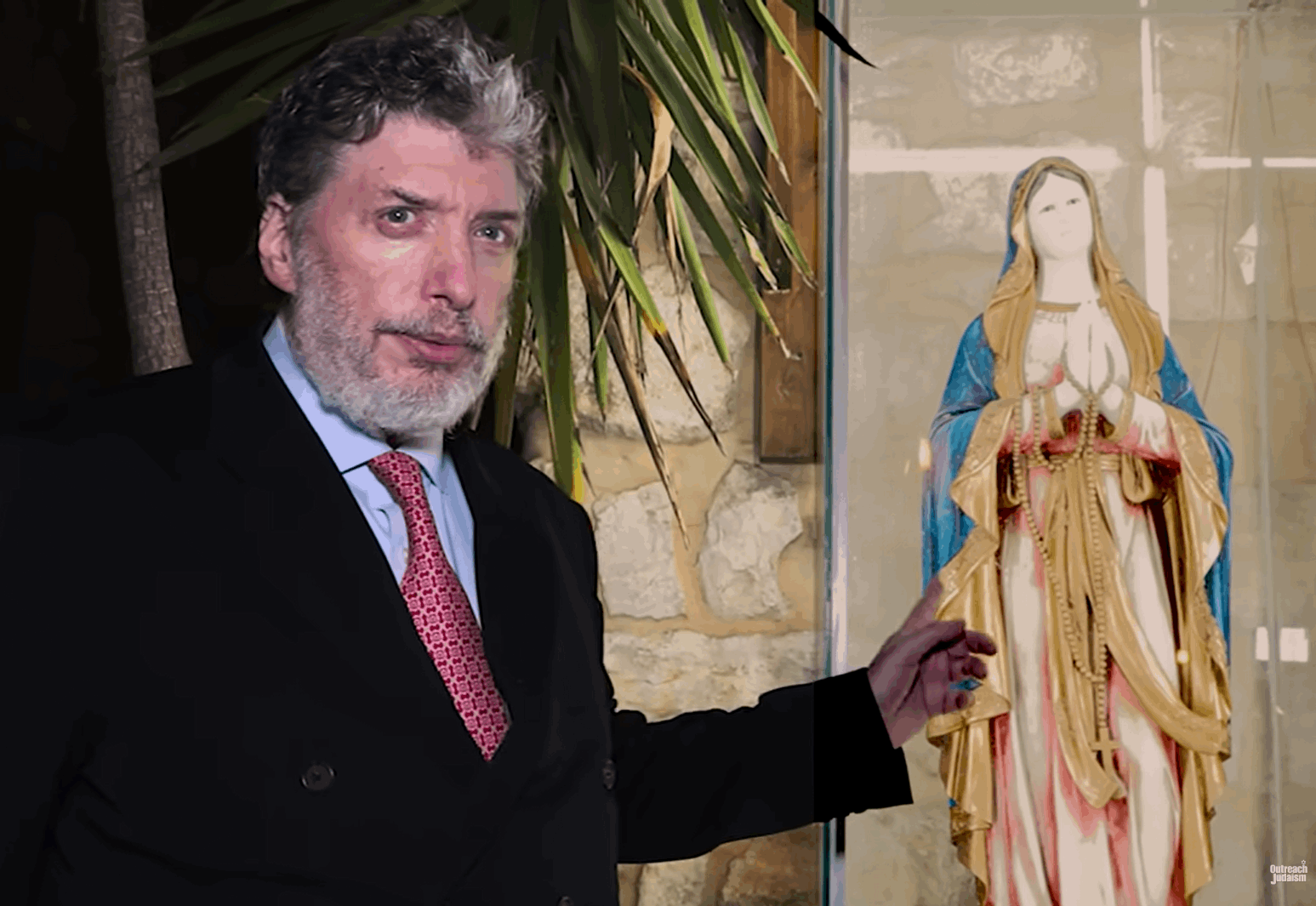 M. Tovia Singer affirme que les « missionnaires » veulent que les juifs rentrent dans l' »Eglise » « ou soit « convertis au christianisme » et pointe ensuite son doigt vers une statut de Marie. Il insinue ainsi que les « missionnaires » qu’il cite sont des mariologues catholiques romains.